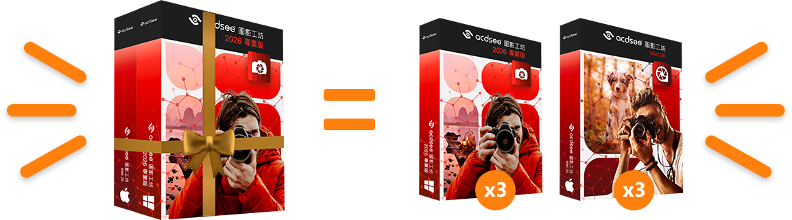 如果您有多臺不同的設備(WINDOWS&MAC)需要進行圖片管理,ACDSee 暢享套餐將是您最優的選擇。套餐中包含ACDSee 圖影工坊 2026 專業版和ACDSee 圖影工坊 Mac 26 分別在Windows和Mac平臺上提供全面的圖像管理與處理